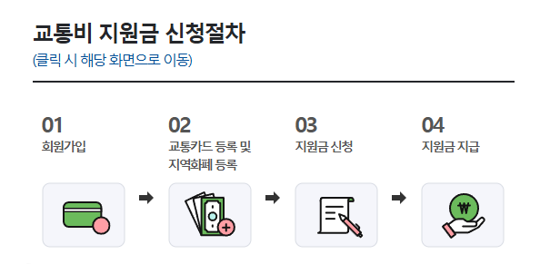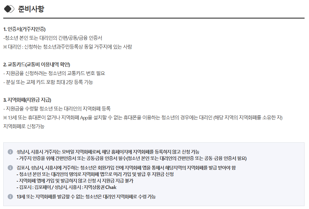 - 교통카드 사용 조건: 본인 명의의 교통카드를 사용하여 대중교통을 이용한 기록이 있어야 합니다.