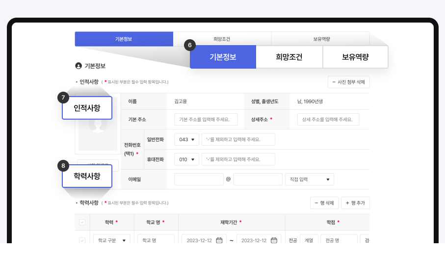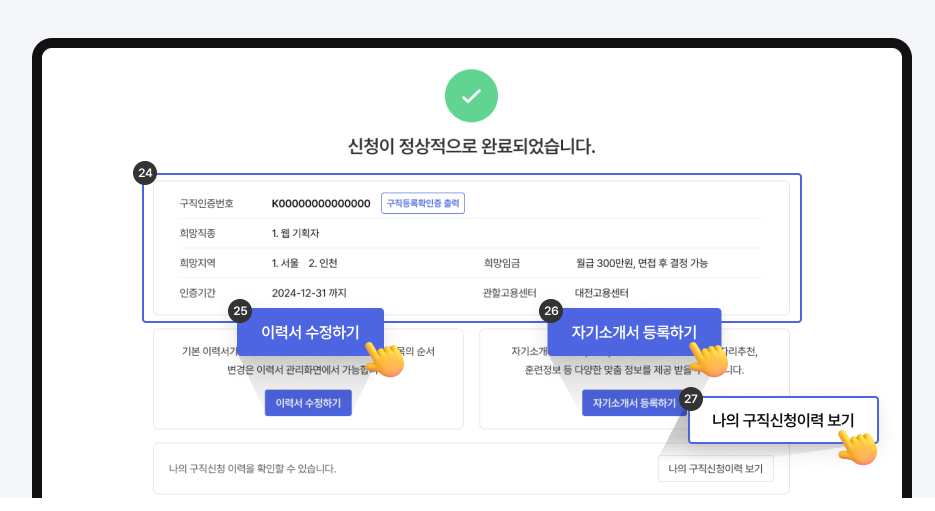 - 워크넷에서 희망 직종, 근무 조건 등을 설정하면 구직 등록이 완료됩니다.
