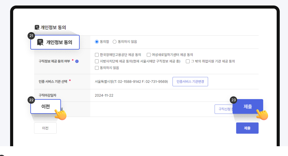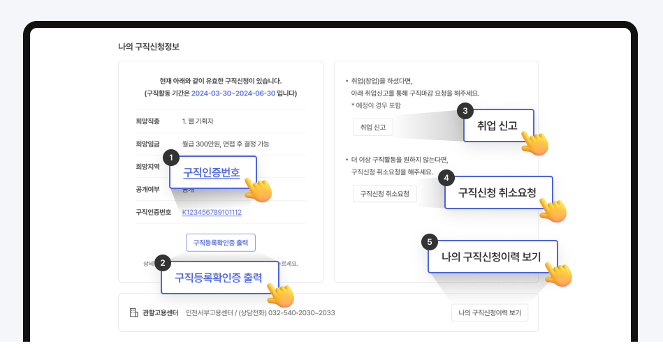 - 워크넷 홈페이지에 가입 후 구직 신청을 등록해야 합니다.