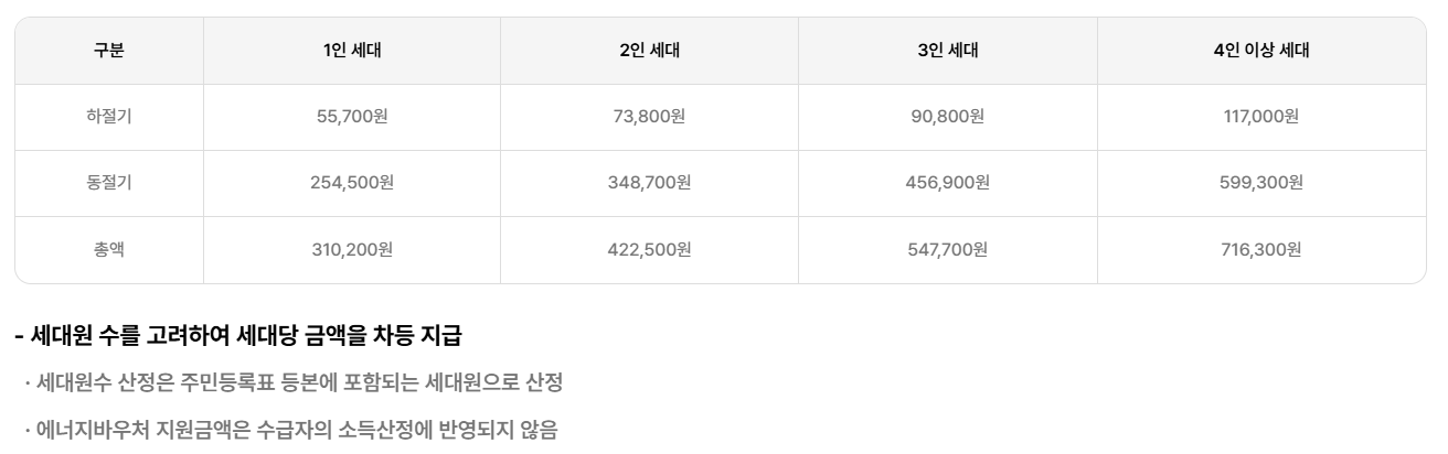 가구 구성원 수에 따라 지원 금액이 달라집니다. 아래는 기준 지원 금액입니다.