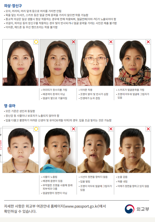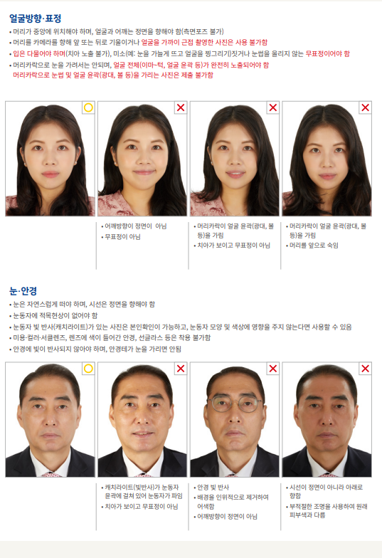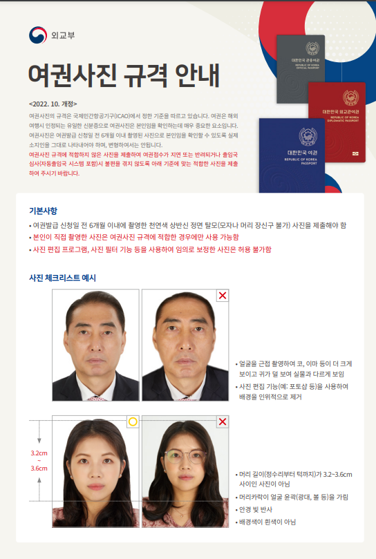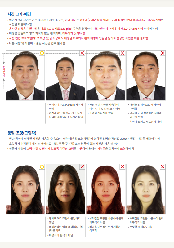 1) 여권 사진 규격 주의 : 여권 사진은 국제 기준에 맞아야 합니다. 사진이 규격에 맞지 않으면 접수가 거부될 수 있습니다.