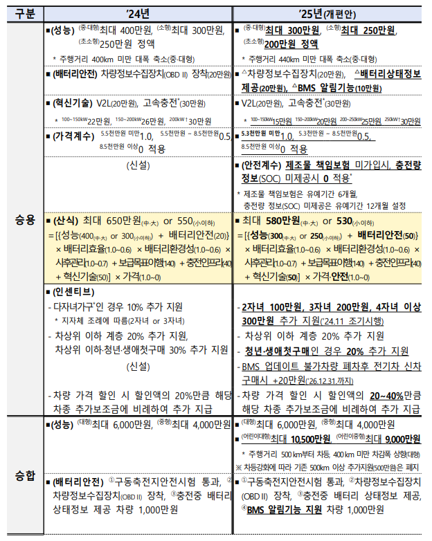 - 주행거리 기준 강화: 1회 충전 주행거리가 긴 차량에 더 많은 보조금을 지급하여 제조사의 기술 혁신을 유도하고, 소비자의 편의성을 높이고자 합니다.