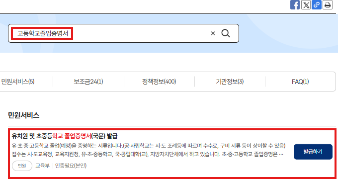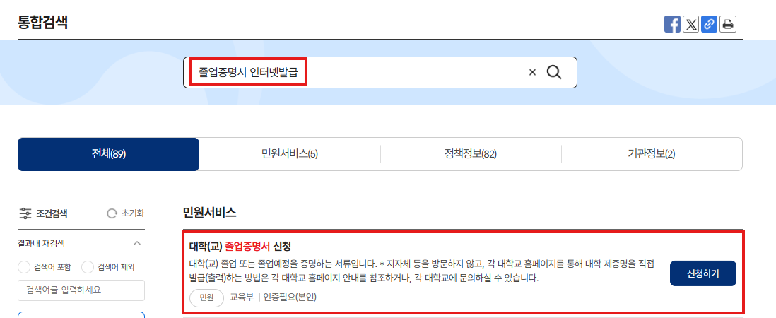 - 검색창에 "졸업증명서 발급"을 입력하세요.